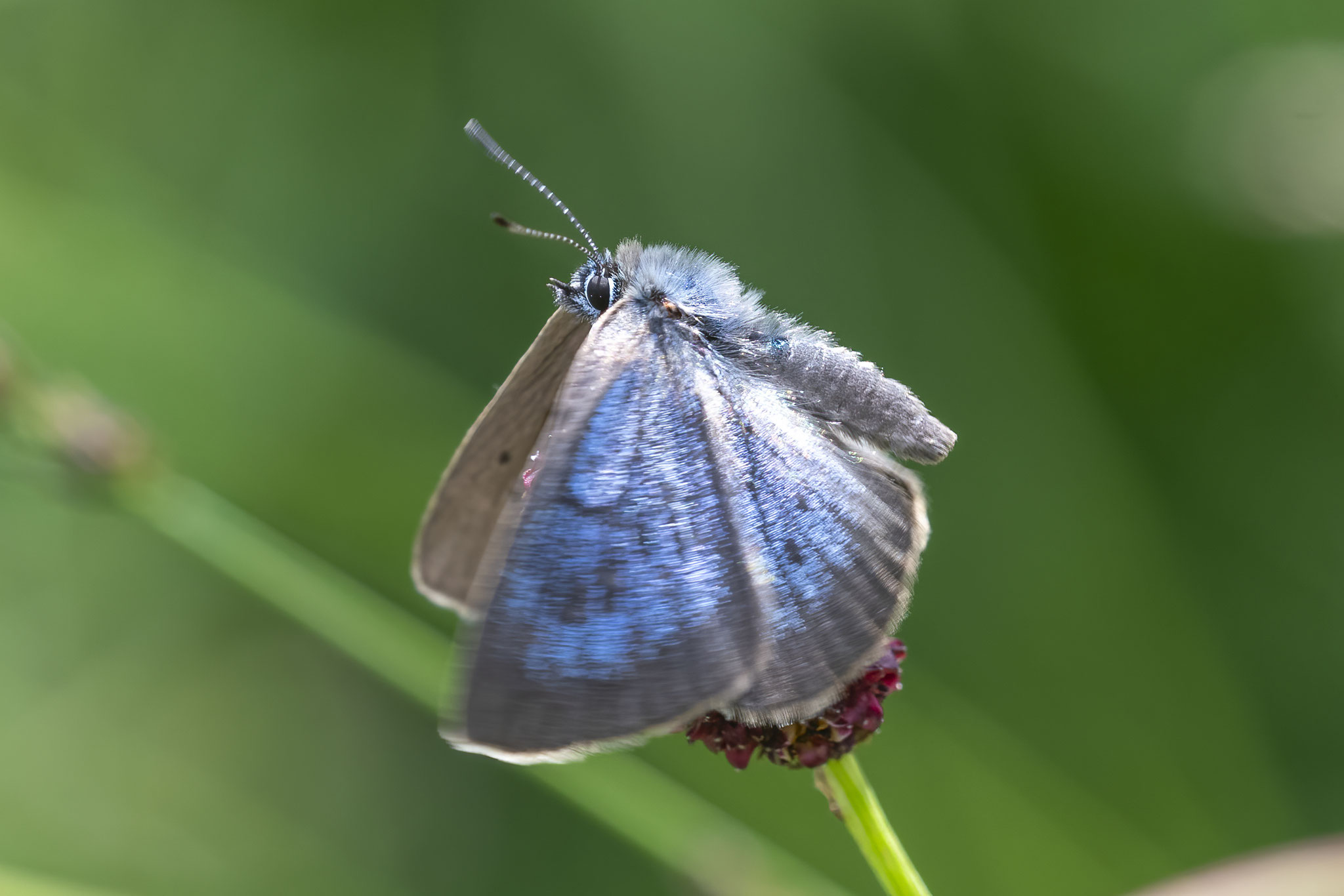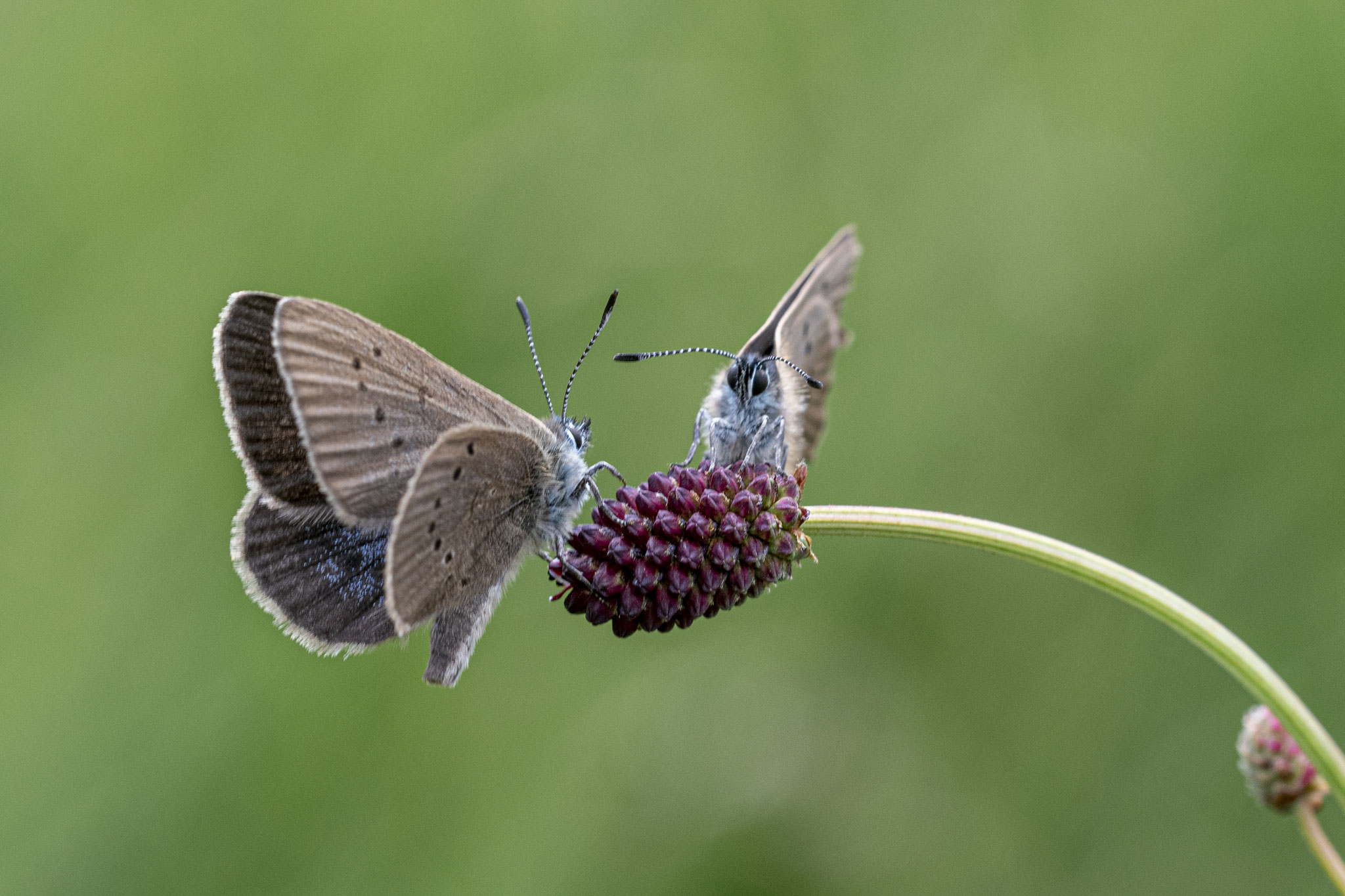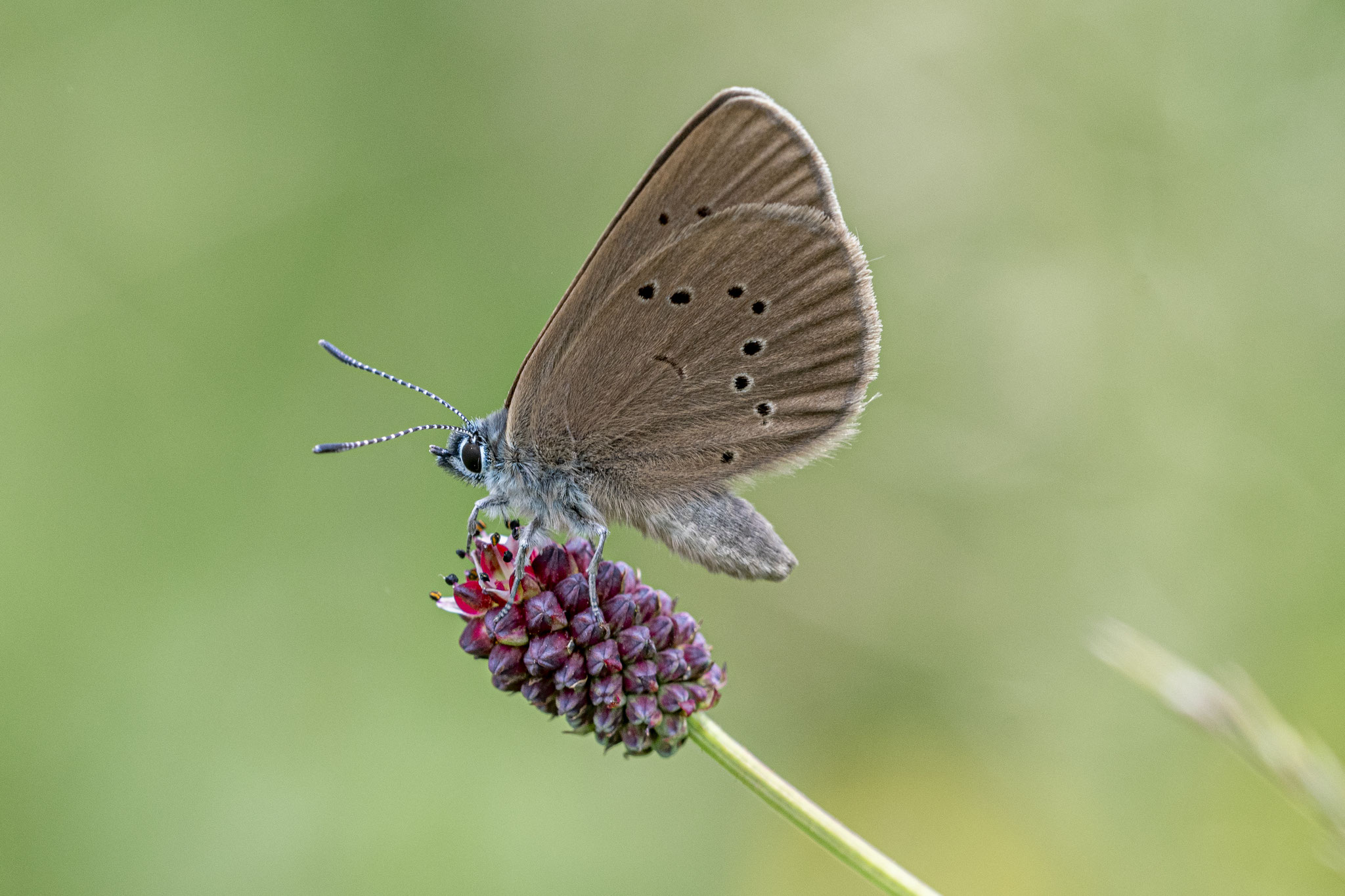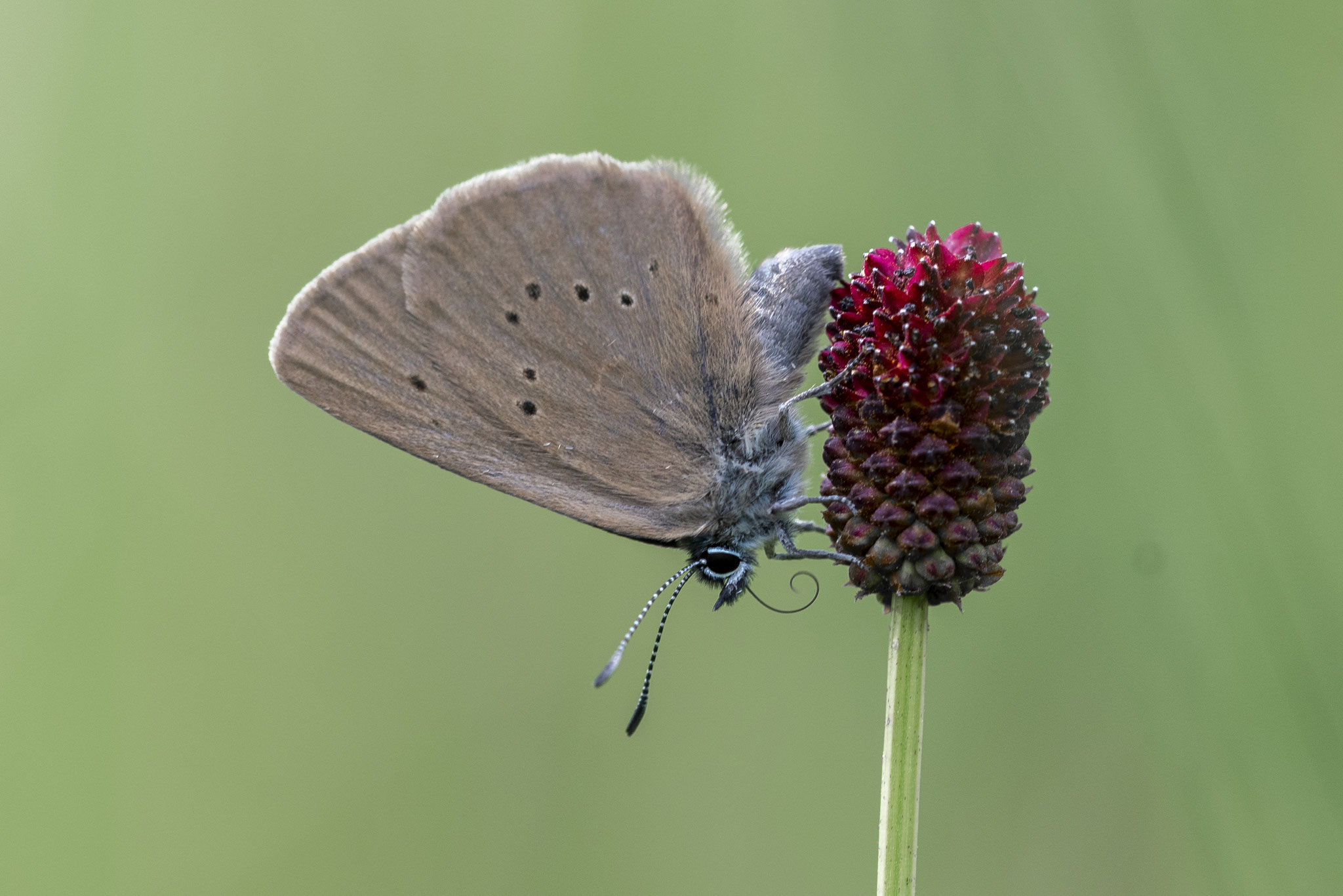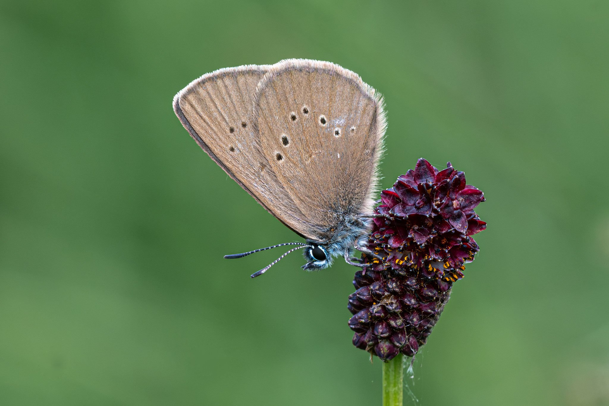 Wer einen Standort kennt, braucht meist nur etwas Geduld: Der Bläuling lässt sich sehr gerne auf den Blüten des Großen Wiesenknopfs nieder – ein guter Moment für ein Foto. Meist zeigt er dabei allerdings nur die schlichte, braune Flügelunterseite. Die blau gefärbte Oberseite bekommt man nur ganz selten zu sehen.
